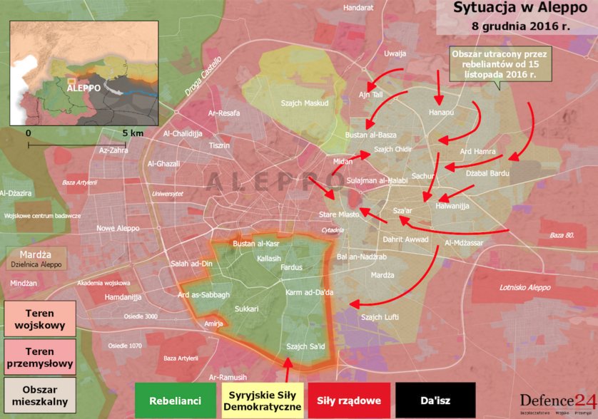 Un mapa que muestra los movimientos de las fuerzas sirias en Alepo, hasta el 8 de diciembre.