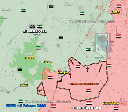 Estimo q lo más interesante de este mapa es el frente q han formado los turcos para detener a las fuerzas sirias, para que no capturen la ciudad de Idlib. Probablemente, tambien intenten impedir la captura de Sarmín, aun que su puesto está al oeste de esa ciudad