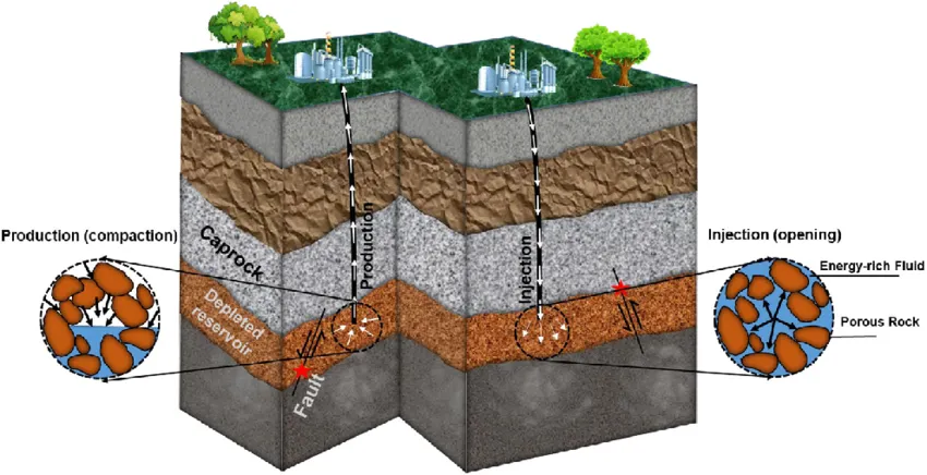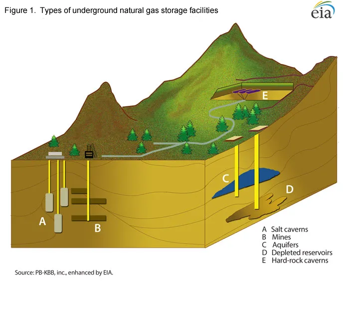En yacimientos y acuíferos agotados, el gas se almacena en formaciones rocosas porosas a miles de metros bajo la superficie, selladas por una capa impermeable de roca que originalmente lo contuvo durante millones de años. El gas no se almacena en una cavidad hueca llena de aire, sino que ocupa poros microscópicos en la roca, desplazando el agua o los hidrocarburos residuales. Esta estructura geológica es una de las principales razones por las que estas instalaciones son inherentemente estables.